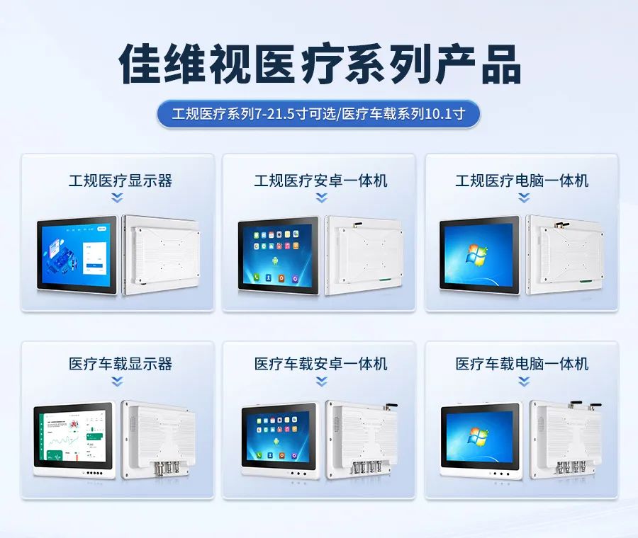 佳维视深入探索医疗应用场景,以强大的硬件基础优势,开发出智慧医疗专线品类,包含医疗显示器、医疗一体机、医疗车载系列等显控产品,具备高性能、多功能、医规认证等特征。